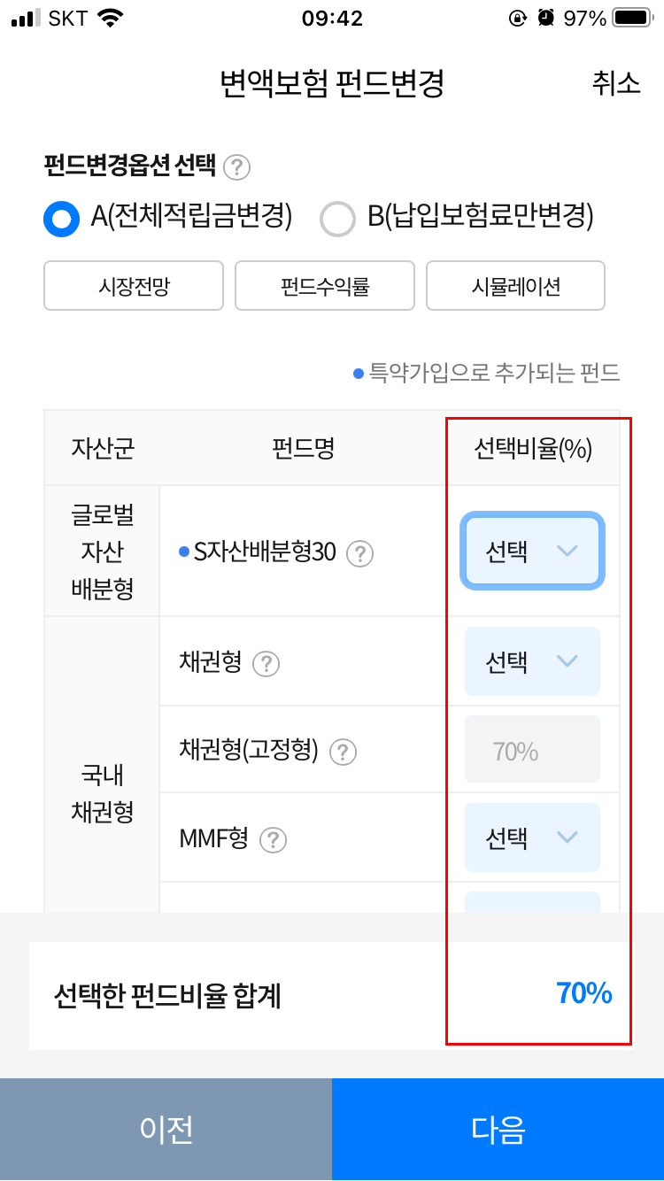 삼성생명에서 제공하는 펀드의 합이 100%가 되도록 설정한 후,