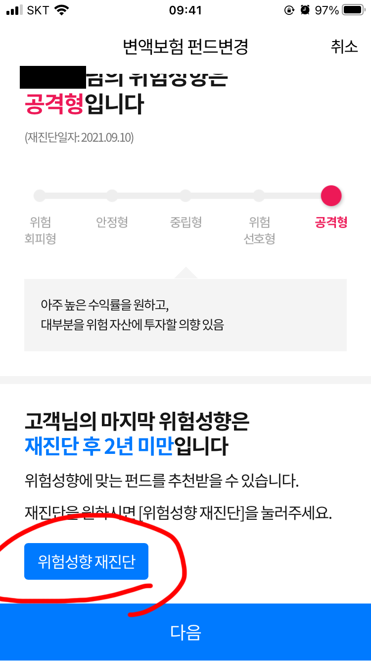 ’위험성향 재진단’ 하기 버튼을 눌러, 자신의 투자 성향을 다시 진단한 후 펀드변경을 진행합니다.