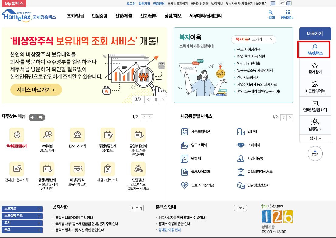1)국세청 홈택스에 접속하여 로그인합니다.